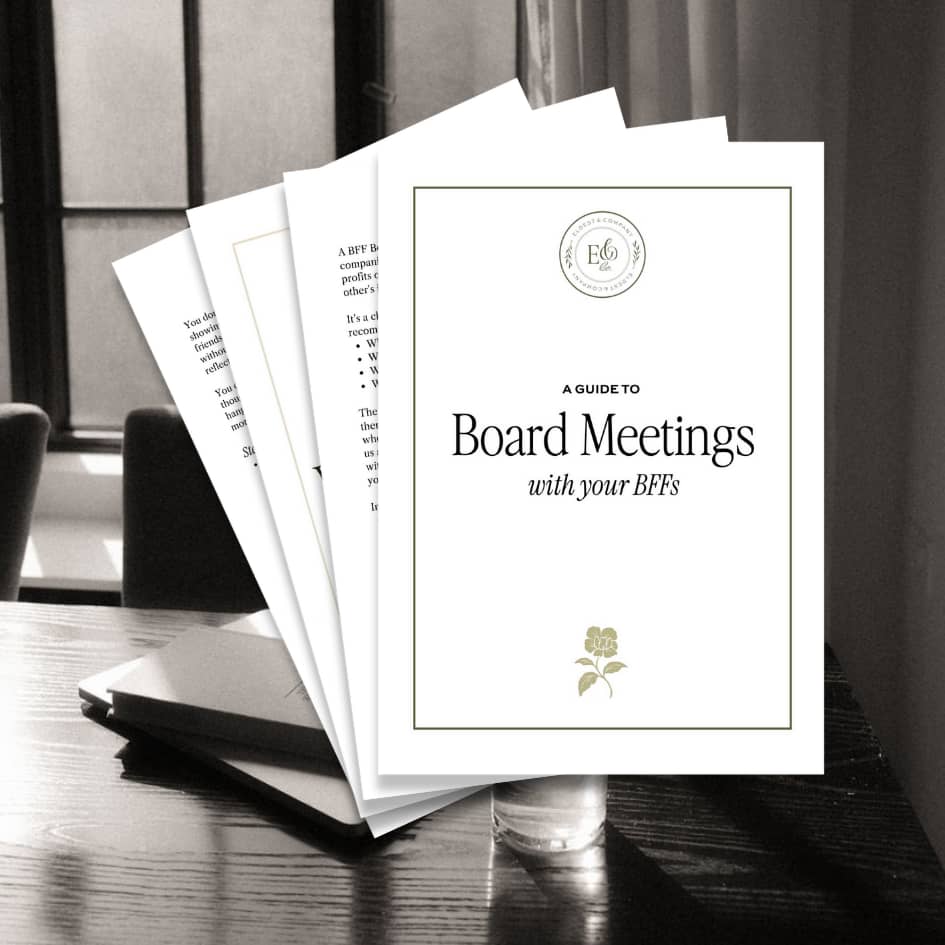 A step-by-step guide to designing, preparing and running a BFF Board Meeting to help you feel organized and prepared to achieve your goals. Decide who's the best fit (or run it solo), reflect and then design goals to suit your life so you feel equipped to successfully achieve them!